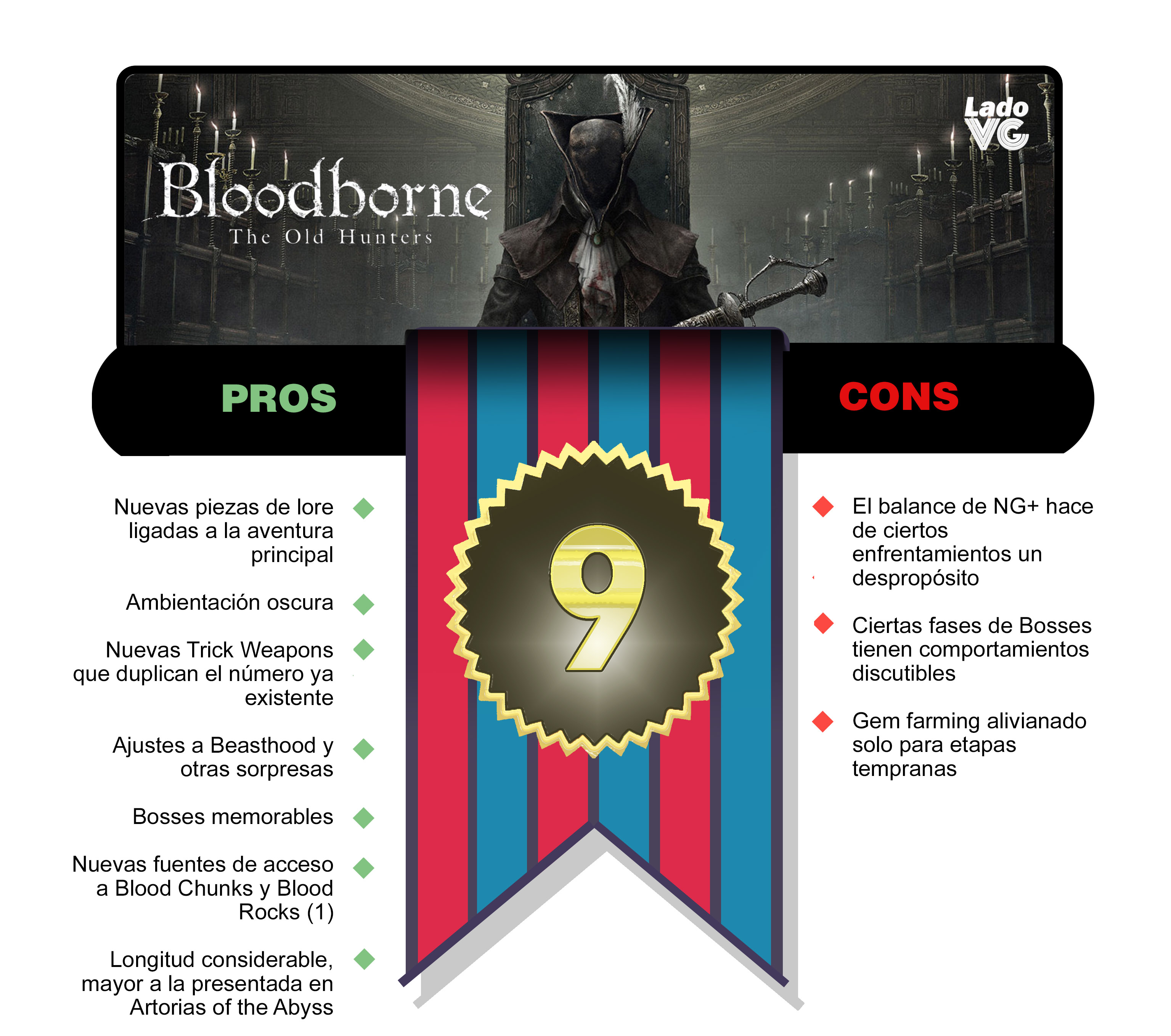 10 personajes perdidos por «corrupted save data» y una nueva tanda de 6 builds diferentes con más de 50 horas en Cursed -Root-Defiled Chalice Dungeons estaban listos para recibir a The Old Hunters. Bajo la terminología «expansión» el retorno a Yharnam destaca en todos los aspectos posibles buscando satisfacer las demandas de mayor variedad de builds/armamento mientras que el resto de los pilares sobre los cuales From Software diseña sus juegos permanecen intactos dando lugar a una de las experiencias más complejas hasta el momento. The Old Hunters, tal vez por presentar una temática oscura pero de forma delicada, podría ser considerado el hermano mayor de Artorias of the Abyss. Con The Astral Tower como referencia nos adentramos en una nueva pesadilla «Despertamos» en The Hunter’s Dream y un ítem llamado «Eye of the Blood-drunk Hunter» es la llave hacia otra pesadilla. En una versión distorsionada de Cathedral Ward nuestro personaje se encuentra en plena batalla entre cazadores y bestias aunque por supuesto, fiel al espíritu de From Software, somos el enemigo de ambos. Esta disputa que se extiende hasta el presente está lejos de ser el nudo principal de esta narrativa ya que como ya sabemos detrás de una «Nightmare Realm» hay un «Great One». Sin recaer en spoilers The Old Hunters vuelve a presentar todas las piezas del rompecabezas de la misma manera ambigua que acostumbra Hidetaka Miyazaki, es decir mediante la ambientación y diálogos de NPCs los cuales son mas importantes que nunca. A medida que exploremos esta pesadilla nos vamos a encontrar con muchos iconos mencionados por descripciones de ítems/cazadores del Yharnam de hoy en día lo que no solo permite analizar el lore de manera más preparada sino que también nos invita a replantearnos (como lo hizo Dark Souls) quien es el bueno/malo. Bajo una atmósfera digna de H.P. Lovecraft un NPC murmura: » ¿Asi que nuestros padres pecaron? Nosotros no podemos cargar con este peso para siempre, no es justo…» con esta breve declaración como punto de partida The Old Hunters invita al gamer a realizar conexiones entre las facciones más conocidas del universo de Bloodborne como Byrgenwerth y empezar a construir un juicio propio sobre sus acciones y consecuencias. Como ya se darán cuenta, gente muy atraída por el lore de las entregas de From Software va a encontrarse sumamente satisfecha con la información que provee The Old Hunters ya además de añadir nuevos elementos para especular, esclarece el origen/destino de muchos iconos de The Healing Church y aclara otros interrogantes mas detallistas que circulaban dentro de la comunidad. Todo este caos de intereses viene acompañado de una de las ambientaciones más oscuras vistas hasta el momento y no estoy hablando particularmente de Central Yharnam en el pasado, sino de regiones como The Reaserch Hall que no solo evoca a Lartia y The Duke’s Archives sino que presenta uno de los panoramas más crueles dentro de un título de Fromsoft y da una noción del progreso en el universo de Bloodborne por la búsqueda por la ascensión previo a la instalación de The Choir. Dejando de lado el aspecto narrativo las áreas presentadas podrían diferenciarse en 3 secciones las cuales comparten herramientas clásicas de este estudio incluyendo un diseño interconectado y denso, utilizando tanto assets de la versión retail como también inspirándose en entregas previas de este estudio o estrictamente en el universo de Lovecraft. Es cierto que al observar muchas regiones no hay mecánicas nuevas que resalten pero los ligeros cambios de ambientación, la presencia de loot en cada región y el comportamiento llamativo de ciertos enemigos forma del encanto de esta expansión y en parte genera esa sensación de inseguridad y ansiedad que no es fácil de imponer en gamers con más de 3-4 cifras en horas de juego. El número de trick weapons se duplicó para fortuna de muchos, sin contar otras opciones igual de tentadoras Ahora bien, no tiene mucho sentido hablar de mecánicas de gameplay general al analizar un contenido descargable y esto se aplica para The Old Hunters ya que no hubo un cambio en las dinámicas de juego o scaling (salvo algunas sorpresas). Pero es innegable que esta expansión debía suplir de alguna forma ciertas inconsistencias discutibles de la aventura principal empezando por la diversidad de builds/trick weapons. Como mencioné en la review de Bloodborne, la variedad presentada hasta el momento me parecía «suficiente» teniendo en cuenta que Blood Rocks eran un recurso escaso y que además de ser todas viables, cada trick weapon constituía una clase única en materia de moveset. El hecho de que la comunidad hablara de diversidad no se refería a stats, sino a la necesidad de diferenciar cada personaje por su arma lo cual es cierto que se dificultaba según el build elegido (Quality-Ludwig’s Holy Blade, Bloodtinge-Chikage/Reiterpallasch, etc) y afortunadamente The Old Hunters presentó la mayor variedad de trick weapons posible. Esta expansión agobia al jugador con nuevo contenido brindándole un acceso rápido a 11 trick weapons cuyos stats se ajustan a todas las diversidades de builds posibles, 5 armas de fuego y 2 Hunter Tools para Arcane Builds cuyo proceso de farmeo es apenas más accesible. Este gran roster que mezcla clásicos desde King’s Field hasta armas sumamente versátiles como Simon’s Bowblade es uno de los aspectos más atractivos de esta expansión, sin tener en cuenta ajustes a mecánicas como Beasthood cuyos efectos actuales parecieran romper el paradigma de un juego de From Software y la presencia de más de 8 sets completos de hunter attire para satisfacer las ansias de «fashionborne» . A la hora de hablar de dificultad esta DLC fue experimentada desde 3 enfoques distintos: al nivel recomendado (lvl. 65), con builds ya preparados en NG (lvl.100 + 27.2% Blood Gems) y en NG+ (lvl.100). Como punto de partida uno va encontrars